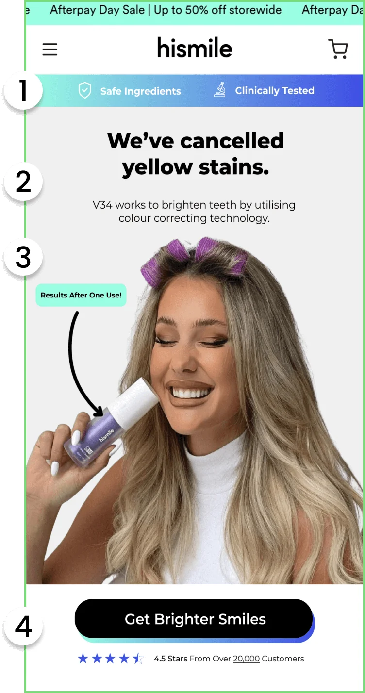 Reassure users & remove potential conflicts. It's important to call out that the product has been clinically tested and it also includes safe ingredients. After doing some quick research on the V34 stain corrector, I was able to find both of these to be true, so why not add them to the first things users see when they land on your site.