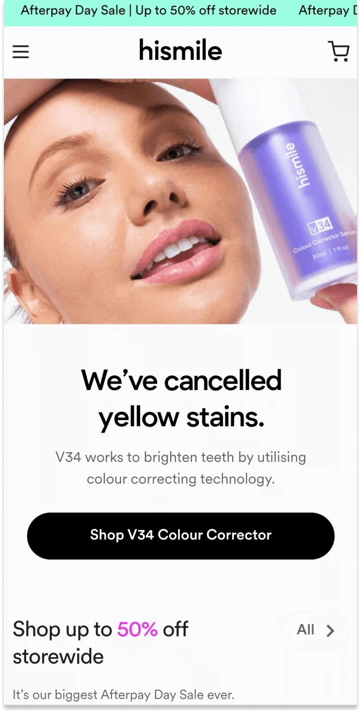 Improve the font weight to draw attention to the main heading "We've cancelled yellow stains" this will be the first thing most people read and draw attention to whilst also touching on a pain point (stained teeth).
